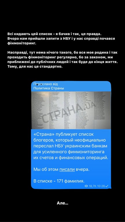 "Всі кидають цей список — я бачив, і так, це правда. Вчора нам прийшли запити з НБУ, і в нас справді розпочався фінмоніторинг. Насправді тут немає нічого такого, бо моя сім'я і так регулярно проходить фінмоніторинг, бо згідно із законом ми наближені до публічних людей і так буде до кінця життя. Тому для нас це стандартно, але…", — написав Заставний.